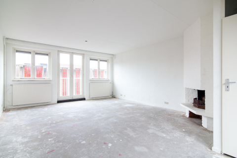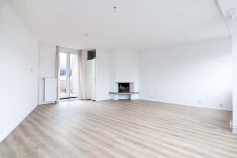 Eerste verdieping: privé entree woning, ruime gang met grote inpandige berging met aansluitingen voor de wasmachine en droger. Wit betegelde toiletruimte met toilet en fontein. Technische ruimte/berging met de cv-ketel en de unit voor de mechanische ventilatie. Moderne badkamer met wit betegelde wanden en uitgerust met inloopdouche met glazen scherm, wastafel met meubel en spiegelkast. Royale, lichte woonkamer (circa 50 m² inclusief de keuken) met glazen pui en deur naar het balkon. Semi-open keuken met veel kast- en bergruimte. De keuken is in L-vormige opstelling en lichte kleurstelling en voorzien van gaskookplaat, afzuigkap, combi-magnetron, vaatwasser en koel-vriescombinatie.